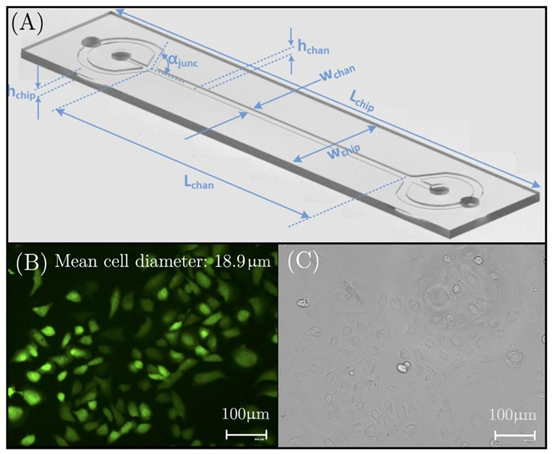(A)重要微通道和芯片特征以及细胞的尺寸,(B)表达EGFP的MDA-MB-231细胞(460倍放大,在509nm处可视化),(C)相同细胞在可见光下的状态。