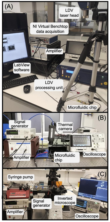 测试装置:(A)振动测量,(B)热测量,(C)微粒和细胞聚焦。