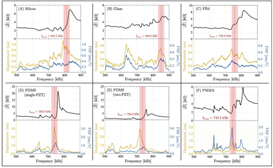 附着在不同器件上的压电致动器的电阻抗振幅、位移振幅的FFT以及频率响应函数(每单位电压输入):(A)硅、(B)玻璃、(C)FR4、(D)PDMS(单个PZT)、(E)PDMS(两个PZT)和(F)PMMA。