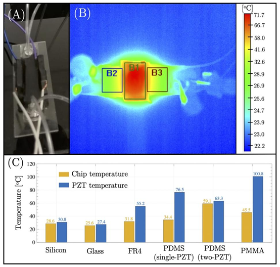 (A)黑色胶带覆盖的PDMS(双PZT)器件,(B)放置在PZT和芯片区域用于温度测量的盒子,(C)不同声泳器件的PZT和芯片材料的平均测量温度。