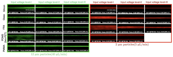 通过 12μm、2μm 聚苯乙烯微球及 MDA-MB-231 乳腺癌细胞(细胞培养芯片常用模型)的聚焦实验,验证材料的声操控能力: