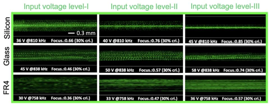 采用台盼蓝染色与 Countess II 自动细胞计数器测试,结果显示:硅、玻璃、FR4 芯片处理后的细胞活力超 75%(对照组 77.5%),而 PDMS 双 PZT 芯片因高温(芯片最高 88.8℃)导致细胞活力降至 69.4%,证明 FR4 在保证声学性能的同时,具备良好的生物兼容性,可用于器官芯片、3D 细胞培养芯片等对细胞活力要求高的场景。