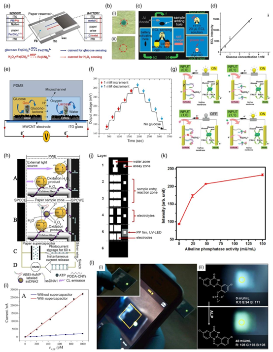 图10. a) 一种基于纸张的微流控传感平台,集成了铝/空气电池,用于检测人工尿液中的葡萄糖。b) 当向该装置中添加葡萄糖时,普鲁士蓝斑点会被还原为普鲁士白。经许可转载。[143] 版权所有2012,美国化学会。c) 一种用于葡萄糖定量传感的自供能微流控折纸电化学发光平台。d) 电化学发光信号与葡萄糖浓度成正比,线性范围为0.1 mM至3 mM。经许可转载。[144] 版权所有2013,英国皇家化学会。e、f) 一种Y形微流控生物燃料电池,配备了经葡萄糖氧化酶和漆酶修饰的多壁碳纳米管电极,用于葡萄糖的连续监测。根据CC-BY许可条款转载。[51c] 版权所有2020,作者。由MDPI出版。g) 基于微流控IMPReset逻辑的生物燃料电池生物传感器在不同ATP和凝血酶输入条件下的状态示意图。经许可转载。[145] 版权所有2010,英国皇家化学会。h) 用于检测人血清中ATP的低成本、便携式折纸纸质微流控光电化学装置示意图。i) 有无超级电容器放大情况下,所产生的光电流与ATP浓度的对比。经许可转载。[23d] 版权所有2013,美国化学会。j、k) 一种带有镁阳极的纸质微流控电池,为芯片上的荧光分析供能,用于碱性磷酸酶的定量分析。l) 智能手机可用于量化荧光信号强度,从而[146] 测量碱性磷酸酶的活性。经许可转载。版权所有2014,AIP出版有限责任公司。