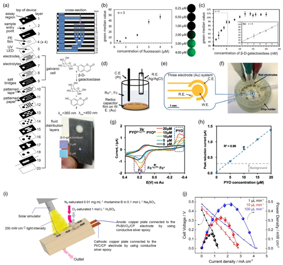 将sidase添加到装置中后,它发生反应形成荧光染料7-羟基香豆素,随后该荧光染料被紫外发光二极管(UV-LED)照亮。重现图11。a)一种纸基微流控装置,其集成了电池,可为紫外发光二极管供电,用于检测\(\beta-c\) -半乳糖苷酶。当β-D-半乳糖(存在时),经许可重现。版权所有2012,英国皇家化学会。b)使用配备相机的手机测量荧光强度,对β-D-半乳糖苷酶浓度进行定量测定。c)荧光强度与β-D-半乳糖苷酶浓度之间的关系。经许可重现。[150]版权所有2014,英国皇家化学会。d)一种容纳生物基 redox 电容器薄膜的微流控装置示意图,该装置用于检测绿脓菌素。e、f)生物基 redox 电容器薄膜由三电极系统构成,该系统用壳聚糖、苯酚和儿茶酚功能化,以进行氧化还原反应。g)不同绿脓菌素(PYO)浓度下的循环伏安曲线(CVs)和h)峰值还原电流。经许可重现。[24c]版权所有2018,英国皇家化学会。i)一种3D打印的微流控光电化学电池,用于将污染物罗丹明B(RhB)降解为电能。j)在不同电解质流速下,该微流控光电化学电池的性能。经许可重现。[151]版权所有2020,美国化学会。
