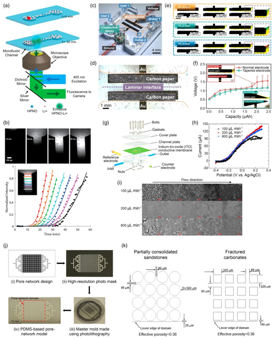 图12. a) 利用宽场荧光显微镜在直微流控通道中追踪锂离子。b) 利用荧光指示剂2-2(-羟基苯基)萘并噁唑追踪微流控通道不同位置的锂离子。经许可转载。[158] 版权所有2017,美国化学会。c-e) 利用比色法5,10-双(2-甲氧基乙基)-5,10-二氢吩嗪阴极电解液对无膜微流控液流电池进行原位可视化。f) 不同电极几何形状下电池性能的比较。根据CC-BY许可条款转载。[159] 版权所有2022,作者。由美国国家科学院出版。g) 用于微生物燃料电池中生物膜形成原位可视化的微流控平台。h) 电化学性能和i) 不同阳极电解液流速下生物膜形成的比较。经许可转载。[160] 版权所有2020,爱思唯尔。j) 用于CAES系统中两相流体流动建模的基于PDMS的微流控芯片。k) 所建模的两种储层的微柱设计。经许可转载。[161] 版权所有2019,施普林格·自然集团。