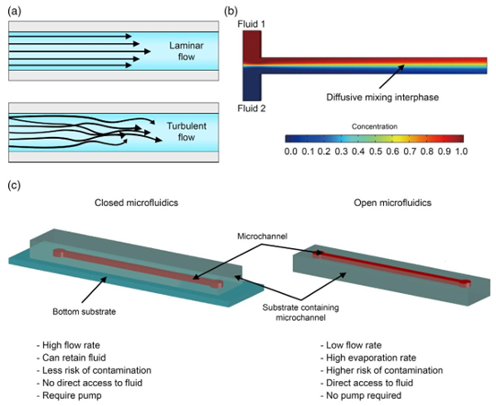 图2. a)层流和湍流的示意图。b)两种流体在T形微混合器中流动的模拟,混合仅通过扩散在界面处发生。经许可转载。[18]版权所有2020,施普林格·自然。c)封闭式和开放式微流控系统的示意图,及其各自的优缺点列表。