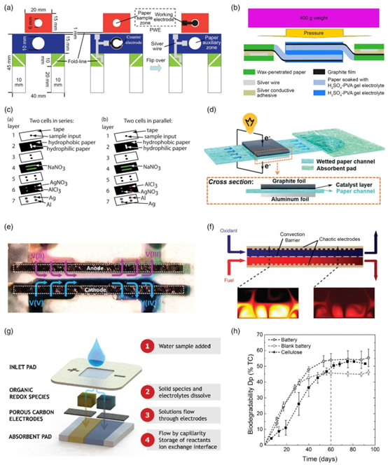 图3. a) 一种微流控光电化学折纸装置,以及b) 内置全固态纸基超级电容器,该电容器包含石墨膜电极和\(H_{2} SO_{4} -PVA\)凝胶电解质。经许可转载。版权所有2013,美国化学会。c) 利用银或铝电极以及\(AgNO_{3}\)和\(AlCl_{3}\)电解质的微流控电池,这些电池可串联或并联。经许可转载。版权所有2012,英国皇家化学会。d) 微流控铝-空气电池的示意图,该电池包含夹在铝箔阳极和石墨阴极之间的纸质通道。经许可转载。[3a]版权所有2019,英国皇家化学会。e) 具有电解质共层流的无膜微流控氧化还原电池的图像。经许可转载。[26]版权所有2013,英国皇家化学会。e) 在微流控通道中加入混合元件以增强微流控电池中的质量传输。经许可转载。[27]版权所有2012,美国化学会。g-h) 一次性可生物降解的PowerPAD微流控电池使用多孔碳电极和有机电解质。经许可转载。[28]版权所有2017,Wiley-VCH GmbH。