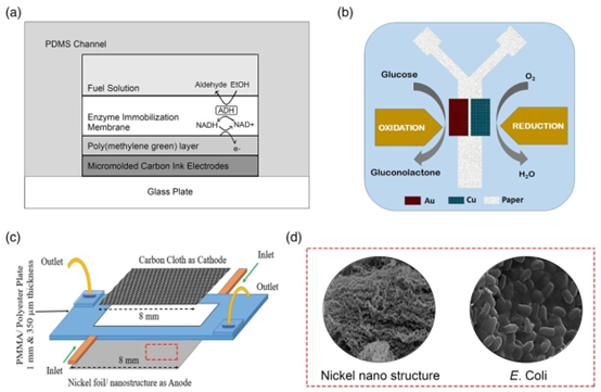 图4. a) 一种基于PDMS的微流控生物燃料电池,其碳墨水阳极经聚(亚甲基绿)和乙醇脱氢酶修饰。经许可转载。[50] 版权所有2004,英国皇家化学会。b) 一种非酶葡萄糖微流控生物燃料电池,采用金属催化剂而非生物催化剂。该芯片由Y形纸基微通道构成,并装配有金电极和铜电极。经许可转载。[55] 版权所有2021,爱思唯尔。c、d) 在以大肠杆菌为生物催化剂的微流控微生物燃料电池中掺入镍纳米结构以提高性能。[56] 经许可转载。版权所有2019,爱思唯尔。