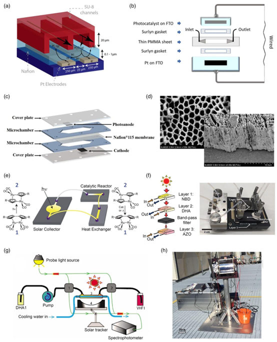 图5. a) 一种蒸汽供料的太阳能微流电解器,其包含聚合物离子导体薄膜,可直接从空气中吸收水分。经许可转载。[86] 版权所有2012,英国皇家化学会。b) 一种夹层式微流光电化学电池的示意图,用于太阳能驱动的\(CO_{2}\)转化为甲醇和甲酸盐。经许可转载。[88] 版权所有2019,英国皇家化学会。c) 一种全钒微流光电化学电池,d) 具有自掺杂的\(TiO_{2}\)光阳极,用于太阳能存储。经许可转载。版权所有2021,爱思唯尔。e) 一种微流控MOST,包括太阳能收集器、催化反应器和热交换器。经许可转载。[95] 版权所有2012,英国皇家化学会。f) 一种基于液体的三层多结MOST器件,使用降冰片二烯、二氢薁和偶氮苯衍生物作为光开关材料。根据CC-By许可条款转载。[96] 版权所有2021,作者。由Wiley-VCH GmbH出版。g) 结合微流控MOST和抛物面聚光器的系统示意图。h) 在自然户外条件下测试该系统的照片。经许可转载。[97] 版权所有2017,Wiley-VCH GmbH。