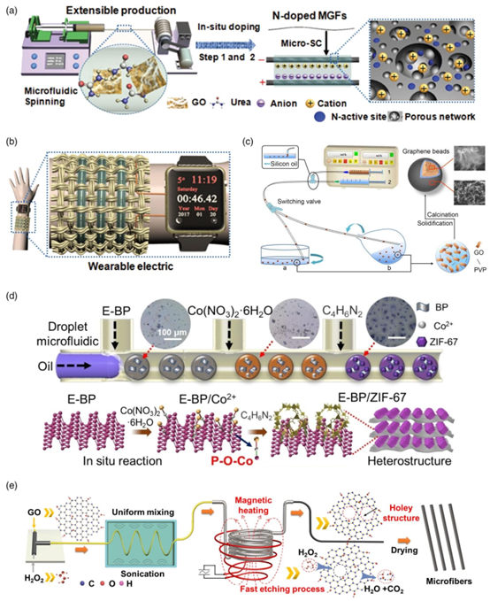 图6. a) 采用微流控纺丝技术制备用于微型超级电容器的均质氮掺杂多孔石墨烯纤维。b) 柔性微型超级电容器在可穿戴电子设备中的应用。经许可转载。[102c]版权所有2017,Wiley-VCH GmbH。c) 用于超级电容器电极的石墨烯微球的微流控液滴制备。经许可转载。[108]版权所有2015,英国皇家化学会。d) 用于制备E-BP/ZIF-67异质结构杂化物的原位超快液滴反应,其中反应物被连续注入微流控液滴装置。经许可转载。[109]版权所有2021,Wiley-VCH GmbH。e) 磁热微流控系统,包括一个受到外部超声作用的T形微通道和一个用于制备[111] CP/HG核壳微纤维的磁性蚀刻装置。经许可转载。版权所有2020,Wiley-VCH GmbH。