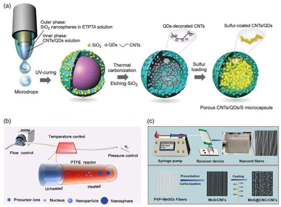 图7. a) 利用同轴液滴微流控技术制备用于锂硫电池正极的多硫化物受限一体化多孔微胶囊。经许可转载。[115] 版权所有2021,Wiley-VCH GmbH。b) 一种用于制备钠离子电池正极材料氟磷酸钒钠的微流控反应器方法,与传统方法相比,该方法所需的制备时间显著缩短。经许可转载。[117] 版权所有2021,爱思唯尔。c) 利用微流控纺丝技术制备嵌入纤维素纳米晶体和MnS纳米颗粒的柔性有序碳纳米纤维膜,作为锂金属电池的中间层。经许可转载。[118] 版权所有2021,爱思唯尔。