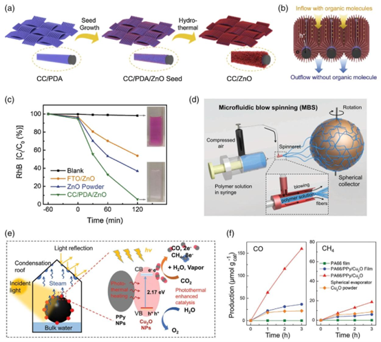 图8. a,b) 经许可的、作为微流控增强光阳极的具有微流控通道的CC/ZnO异质结构的制备示意图。[3b]版权所有2019,爱思唯尔。d) 一种涂覆有PA66纳米纤维和PPy纳米颗粒的3D光热催化球形蒸发器,通过微流控吹纺技术制造。c) 使用微流控增强光阳极时,RhB向\(H_{2}\)的转化得到改善。经许可转载。e,f) 使用球形收集器进行\(CO_{2}\)光还原为一氧化碳和甲烷。根据CC-BY许可条款转载。[3c]版权所有2021,作者。由Wiley-VCH GmbH出版。