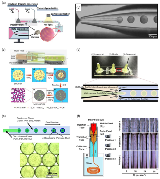 图9. 用于制备a-b)负载\(TiO_{2}\)纳米颗粒的聚(1,6-己二醇二丙烯酸酯)基聚合物以及c)内嵌\(Na_{2} SO_{4} \cdot 10 H_{2} O\)相变材料的\(SiO_{2}\) microparticles的两相液滴微流控乳化技术。经许可转载。[126,127] 版权所有2018,美国化学会;版权所有2017,美国化学会。d) 用于制备封装相变材料的三相液滴微流控乳化技术。经许可转载。[128] 版权所有2019,爱思唯尔。e) 利用管状微流控技术制备核心内嵌\(Fe_{3} O_{4}\)纳米颗粒的正十八烷/聚脲微胶囊。经许可转载。版权所有2013,爱思唯尔。f) 通过微流控纺丝技术制备的柔性RT27/聚乙烯醇缩丁醛核壳结构微纤维相变材料。经许可转载。[130] 版权所有2015,爱思唯尔。