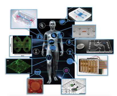 图2:用于人体多种器官的器官芯片平台。从右上角开始按顺时针方向展示了血脑屏障、心肌、肾近端小管、女性生殖道、血管化肿瘤、皮肤表皮、脉管系统、肝脏和肺芯片[15]。