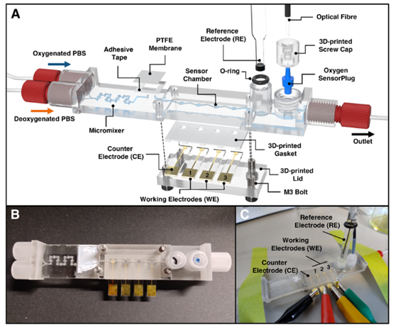 系统采用高分辨率 3D 打印技术(MultiJet 打印机,xyz 轴分辨率 800×900×790 DPI)实现一体化成型,核心结构包括进样模块、HC 型微混合器、PTFE 膜气泡陷阱、传感器腔室及出样模块。微混合器通过特殊流道设计打破层流限制,确保氧富集与氧匮乏的 PBS 溶液快速均匀混合,精准调控不同生理氧浓度梯度;气泡陷阱利用 PTFE 膜的气体渗透性,有效移除流道中的气泡,避免干扰传感信号。