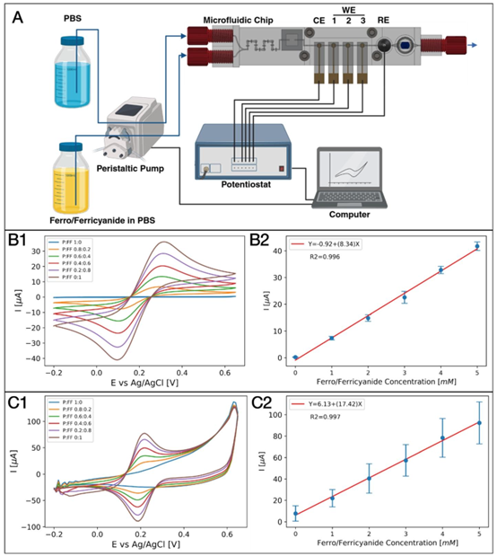 图2 LOC平台验证实验。(A) 实验装置,其中(Fcn(O/R);“FF”)和PBS(“P”)通过蠕动泵以不同比例引入,电极同步感应电活性分析物,评估Fcn(O/R)浓度和电极的有效表面积。蓝色箭头表示流体路径,黑色线条表示电连接。(CE:对电极;WE:工作电极;RE:参比电极)。(B) 使用金电极作为工作电极的循环伏安图。(1) 使用不同流量比(P:FF)的循环伏安图;(2) 阳极峰值电流与预期Fcn(O/R)浓度的函数关系,显示出正线性关系(\((R^{2}=\)为0.996),与伦德尔斯-塞夫奇克方程一致。(C) 使用涂覆铂黑(PtB)电极作为工作电极的循环伏安图。(1) 使用不同流量比(P:FF)的循环伏安图;(2) 阳极峰值电流与预期Fcn(O/R)浓度的函数关系,显示出线性关系(\((R^{2}=0.997)\)),与伦德尔斯-塞夫奇克方程一致。误差线代表LOC平台中三个工作电极的平均值(标记)和标准偏差(帽状线)。