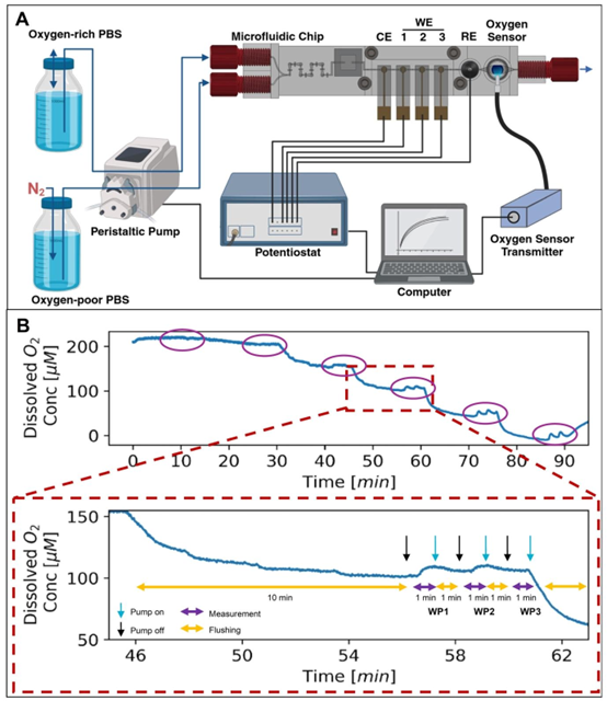 图3 微流控LOC中的溶解氧电化学检测。(A)实验装置,其中富氧(\((O_{2})\))和贫氧(\((N_{2})\))溶液由蠕动泵以不同比例输送,氧气浓度通过对氧还原反应(ORR)的计时电流法定量来测量(CE:对电极;WE:工作电极;RE:参比电极)。(B)SensorPlug在整个实验过程中的氧气信号,显示贫氧溶液比例越高,氧气水平越低。紫色圆圈突出显示了电化学测量的序列。放大到20分钟时间范围的图表展示了针对每个比例执行的测量序列:(1)冲洗10分钟,随后是测量序列;(2)停止流动10秒以释放任何残余压力;(3)对单个工作电极进行1分钟测量;(4)再冲洗1分钟。步骤2-4对每个工作电极重复进行。黑色箭头指示泵的停止,蓝色箭头指示泵的启动。