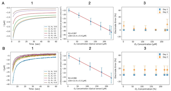 图4 基于ORR的氧传感结果,使用(A)金工作电极和(B)铂黑涂层工作电极。(1)使用不同流速比的贫氧和富氧溶液的ORR计时电流图;(2)电荷密度与光学氧传感器读数的函数关系,显示出明显的线性关系(\((Au: -14.3-0.11 ×dO_{2}\) \(R^{2}=0.997\):\(LOD =15.4 \pm 0.4 \mu M\):PtB:\(-13.7-0.05 ×dO_{2}\)。\(R^{2}=0.998\);\(LOD=11.2 \pm 0.3 \mu M\));(3)电化学LOC的稳定性测试,显示第1天(橙色)和第2天(蓝色)电荷密度随氧浓度的变化,两次测试之间无显著差异。所有误差线代表使用LOC平台的3个工作电极的平均值(标记)和标准偏差(帽状线)。LOD通过方程(2)计算,误差代表标准偏差。