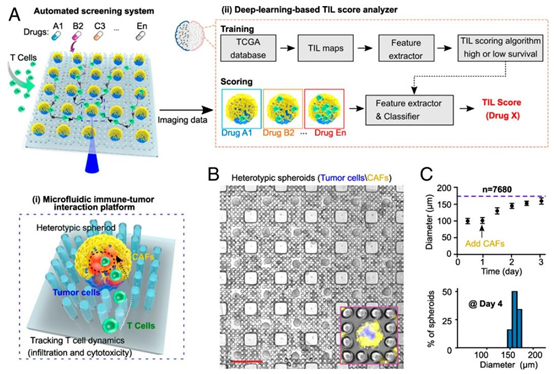 图1. 自动化筛选平台的整合。(A)癌症免疫疗法筛选自动化平台示意图,包括(i)用于高通量追踪T细胞动态行为的微流控免疫-肿瘤相互作用平台,以及(ii)基于深度学习的肿瘤浸润淋巴细胞(TIL)评分分析仪,用于图像处理和对与高生存率(\((>3 y)\))或低生存率患者群体图像中发现的TIL模式相对应的T细胞浸润模式进行评分。(B)核心/肿瘤壳/基质球体的可扩展微流控制造(肿瘤核心:蓝色,癌相关成纤维细胞(CAF);壳:黄色)。(C)柱状晶格阵列内的球体生长(箭头指示肿瘤核心形成后的CAF接种),以及球体形成第4天时肿瘤-基质球体的尺寸分布。(B中的比例尺:500μm。)