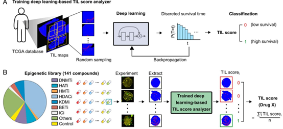 图3. 基于深度学习和临床数据的评分。(A) 使用TCGA数据库中411名患者的肿瘤H&E图像及相关患者生存信息训练基于深度学习的TIL评分分析器的示意图。(B) 示意图展示了141种小分子表观遗传调节剂库的筛选过程。我们的自动化系统追踪每种药物的T细胞肿瘤浸润图像,提取T细胞图谱,为每张图像分配TIL评分i(例如0、1),并通过对药物处理图像的多个TIL评分i取平均值,生成药物X的最终TIL评分。