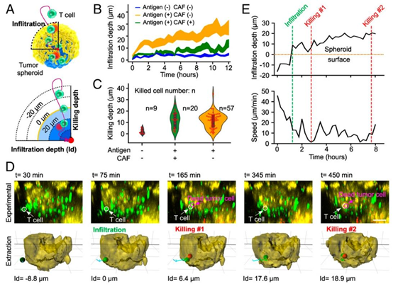 图2. T细胞肿瘤浸润和细胞毒性的追踪动态。(A)T细胞与肿瘤-基质球体之间动态相互作用的示意图。T细胞浸润深度定义为细胞到球体表面的径向距离,一旦T细胞浸润到球体内(或在球体外),浸润(或杀伤)深度为正(或负)。(B)T细胞浸润对肿瘤核心抗原呈递(抗原(+))和基质/CAF外壳存在(CAF(+))的依赖性。所有线条均带有68%置信区间(CI)。(C)T细胞杀伤深度和能力(n:被杀伤细胞数量)对肿瘤核心抗原呈递(抗原(+))和基质/CAF外壳(CAF(+))的依赖性。(D)肿瘤-基质球体内单个T细胞同时浸润和杀伤动态的延时图像及其提取(来自补充视频S1)。白色(或品红色)箭头和圆圈指示T细胞(或死亡的肿瘤细胞),浸润深度(Id)的负值表示球体外部的T细胞,正值表示球体内部的T细胞。(E)同一T细胞(在D中)随时间的浸润深度和速度的量化。绿色和红色虚线指示该T细胞的浸润和杀伤事件。(D中的比例尺:50μm。)