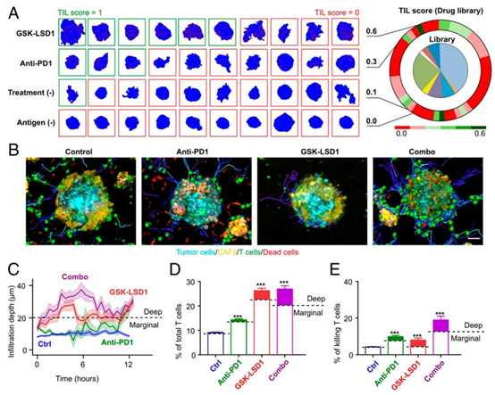 研究团队利用该平台对 141 种表观遗传调节剂进行筛选,通过两步筛选策略:先排除细胞毒性大于 20% 的化合物,再对剩余非细胞毒性药物进行免疫活性评估。最终发现,赖氨酸特异性组蛋白去甲基化酶 1 抑制剂(GSK-LSD1)表现出最优的 TIL 浸润促进效果,其 TIL 评分为 0.6,显著高于 anti-PD1 单药治疗的 0.3 与空白对照的 0.1。
