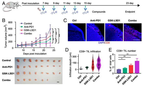 在体外实验中,GSK-LSD1 与 anti-PD1 联合治疗组的 T 细胞浸润深度、浸润数量及细胞毒性比例均显著高于单药组,证实了该组合在促进 T 细胞穿透肿瘤基质并杀伤肿瘤细胞的协同作用。体内 B16F10 小鼠模型进一步验证,联合治疗组的肿瘤生长抑制率显著提升,8 只小鼠中有 2 只实现肿瘤完全消退,肿瘤组织中 CD8+ T 细胞浸润数量较对照组增加 3 倍以上。